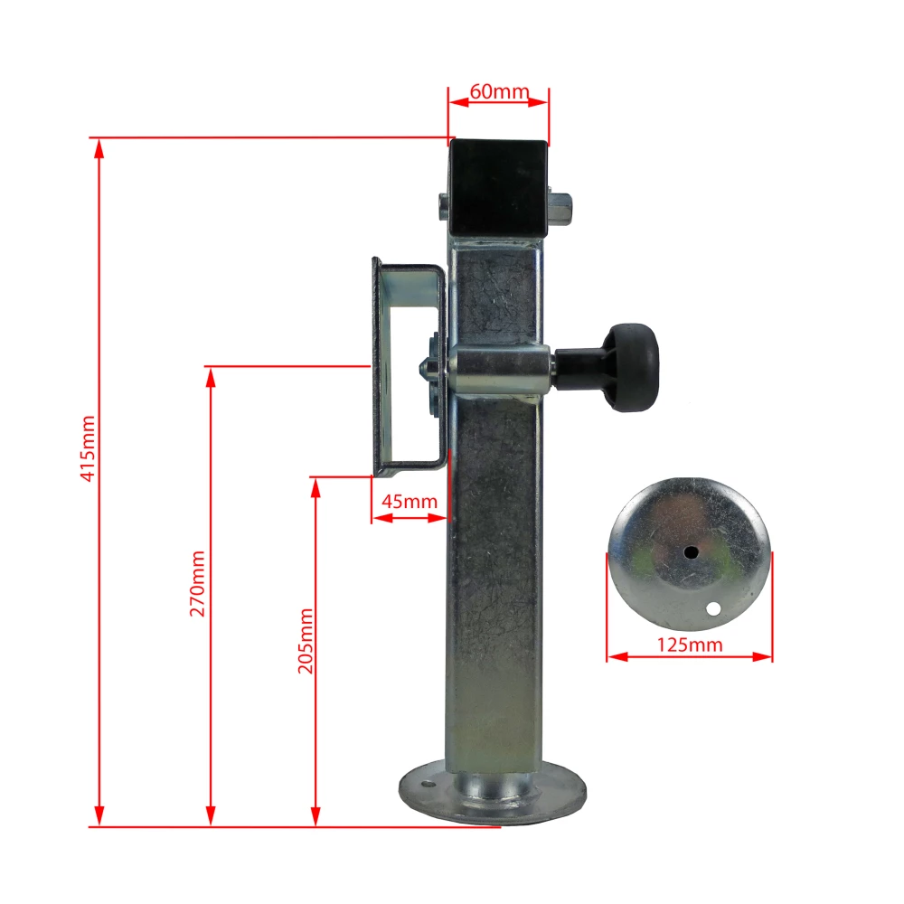 Die Gesamtlänge beträgt 415 mm, mit einem Hub von 240 mm. Eingefahren misst die Stütze 415 mm, ausgefahren 655 mm. Der Abstand von Flanschmitte bis zur Stützplatte beträgt 270 mm, was eine stabile Basis für maximale Standfestigkeit bietet.