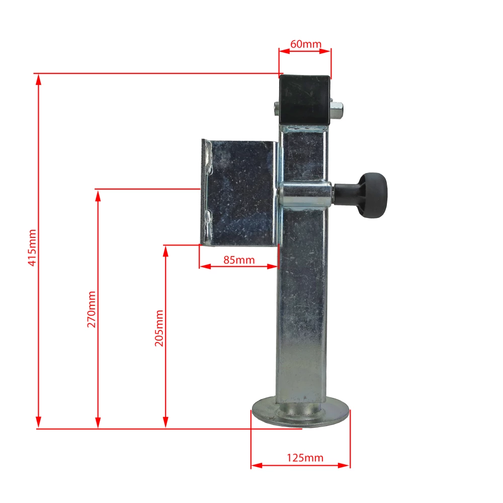 Die Gesamtlänge beträgt 415 mm, mit einem Hub von 240 mm. Eingefahren misst die Stütze 415 mm, ausgefahren 655 mm. Der Abstand von Flanschmitte bis zur Stützplatte beträgt 270 mm, was eine stabile Basis für maximale Standfestigkeit bietet.